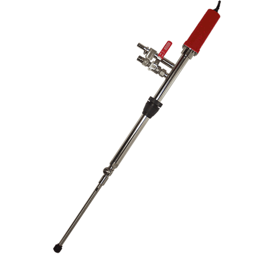 The Barrel Cleaner BRM spray head is inserted into the bung hole from below. The spray head is powered by water hydraulics for a very safe cleaning process.